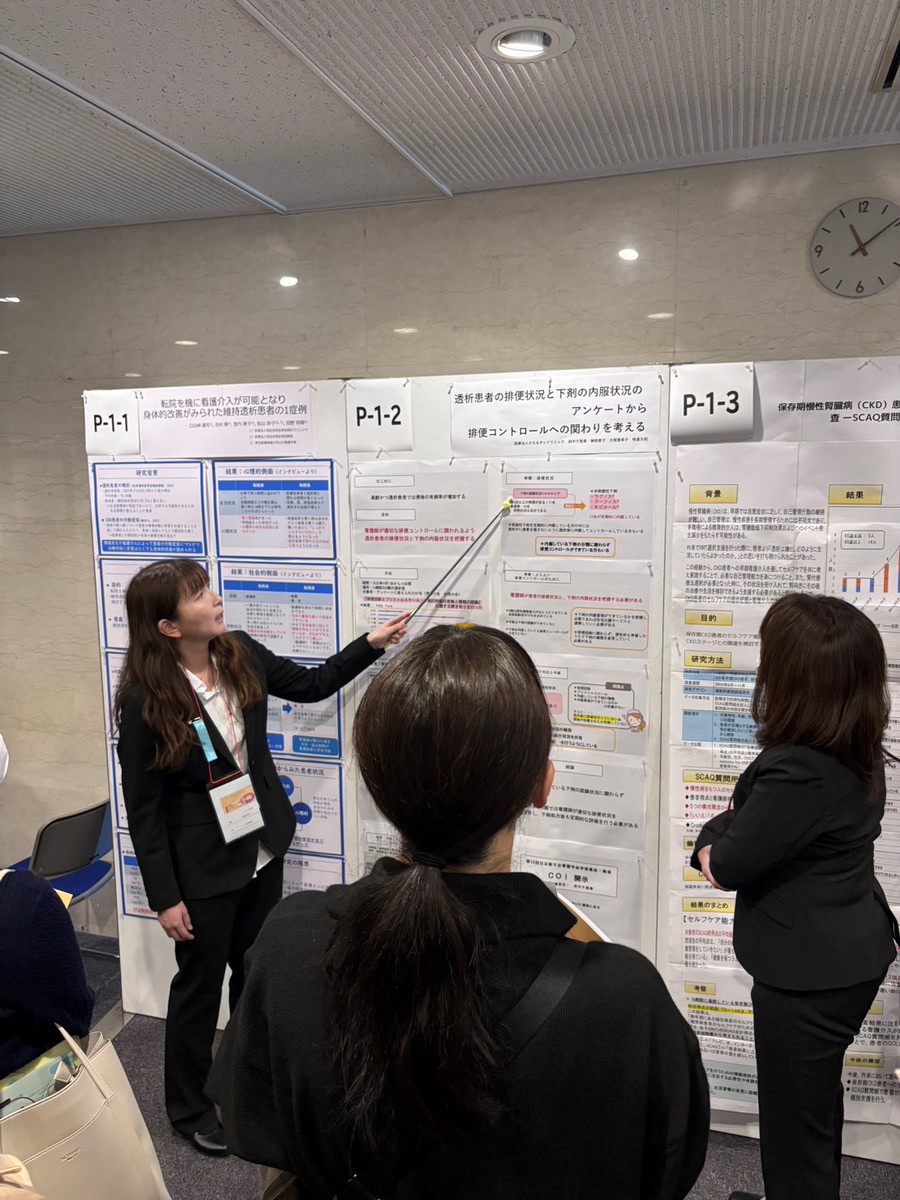 11月29日、神戸国際会議場にて『第28回日本腎不全看護学会学術集会・総会』が開催され、当院看護師がポスターによる一般演題発表を行いました。演題名は「透析患者の排便状況と下剤の内服状況のアンケートから排便コントロールへの関わりを考える」です。